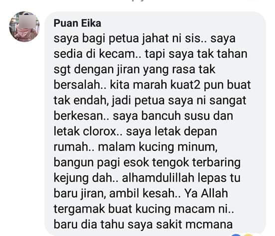 "Alhamdulillah selepas itu baru jiran ambil kisah, "Ya Allah tergamak buat kucing macam ni". Baru dia tahu saya sakit macam mana," tulisya di Facebook.